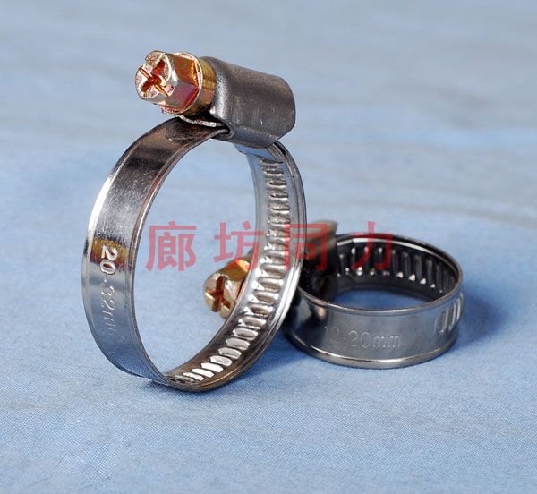 美式喉箍:分為鐵鍍鋅和不銹鋼兩種,主要區(qū)別為扣距為打孔狀(即透眼扣)。