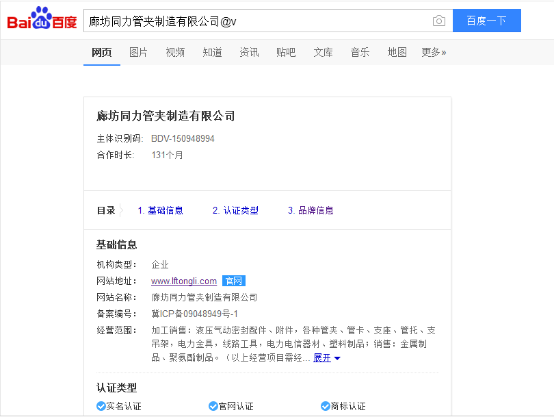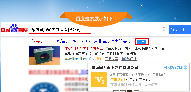 當(dāng)前社會(huì)互聯(lián)網(wǎng)信息的體量是巨大的。在獲取資訊便捷的同時(shí),虛假信息的泛濫也造成了諸多不便。如何能讓客戶在紛繁復(fù)雜的信息里面找到對(duì)的那一個(gè),不會(huì)被虛假信息所蒙蔽造成損失,是我們同力管夾公司深切關(guān)注的。通過和百度信譽(yù)體系的合作,以百度大數(shù)據(jù)為依托,在2018年8月15日正式上線了百度官方網(wǎng)站認(rèn)證。客戶在百度搜索欄中輸入“廊坊同力管夾制造有限公司”,排名靠前的消息且標(biāo)題尾部掛墜藍(lán)色“官網(wǎng)”標(biāo)識(shí)的即為我公司官方網(wǎng)站,網(wǎng)址為“www.shstc.org.cn”。客戶在這個(gè)網(wǎng)站里面看到的內(nèi)容均為真實(shí)有效的,期待您的光臨,特此通知。
